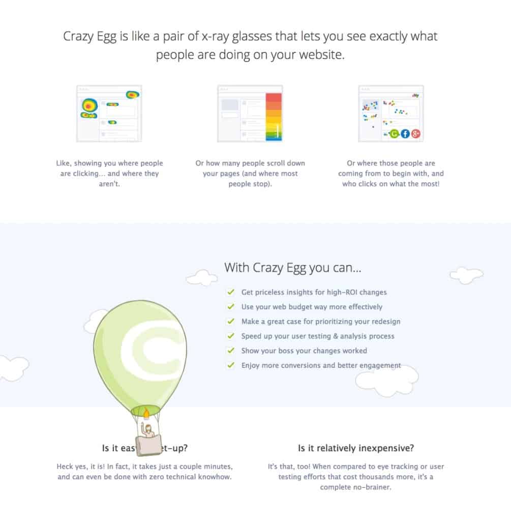 Using CrazyEgg allows you to redesign your website layout in accordance with the demonstrated preferences of the crowd. If you can identify clusters of data with CrazyEgg, you can tweak your design to maximise your chances of higher conversions.